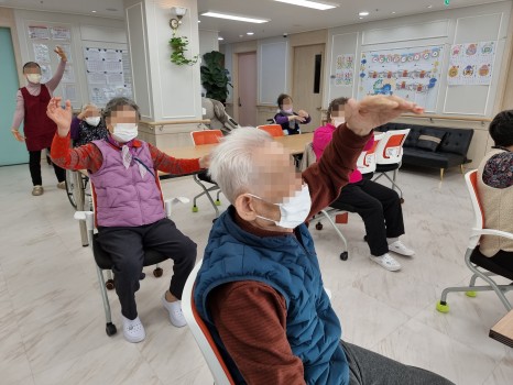 오늘도 밤사이 굳어진 근육을 치매예방 체조, 매일매일 건강체조, 스트레칭으로 풀어주면서 하루를 힘차게 시작하시는 덕양구 주간보호센터 원당노블 어르신들 입니다.